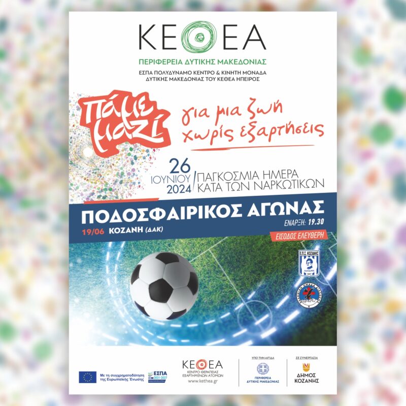 Φιλικό Ποδοσφαιρικό Αγώνα την Τετάρτη 19 Ιουνίου 2024 και ώρα: 19:30 στο Δ.Α.Κ. Κοζάνης. Στον αγώνα θα συμμετέχουν από κοινού, μέλη των Θεραπευτικών Προγραμμάτων του ΚΕΘΕΑ Ήπειρος, καθώς και οι ποδοσφαιρικές ομάδες της Κοζάνης: Α.Ε. ΚΟΖΑΝΗΣ, ΑΚΡΙΤΕΣ, ΜΑΚΕΔΟΝΙΚΟΣ, ΠΑΟΚ ΚΟΙΛΩΝ, ΠΟΔΟΣΦΑΙΡΙΚΗ ΟΜΑΔΑ ΑΣΤΥΝΟΜΙΑΣ & ΔΙΚΗΓΟΡΙΚΟΣ ΣΥΛΛΟΓΟΣ.