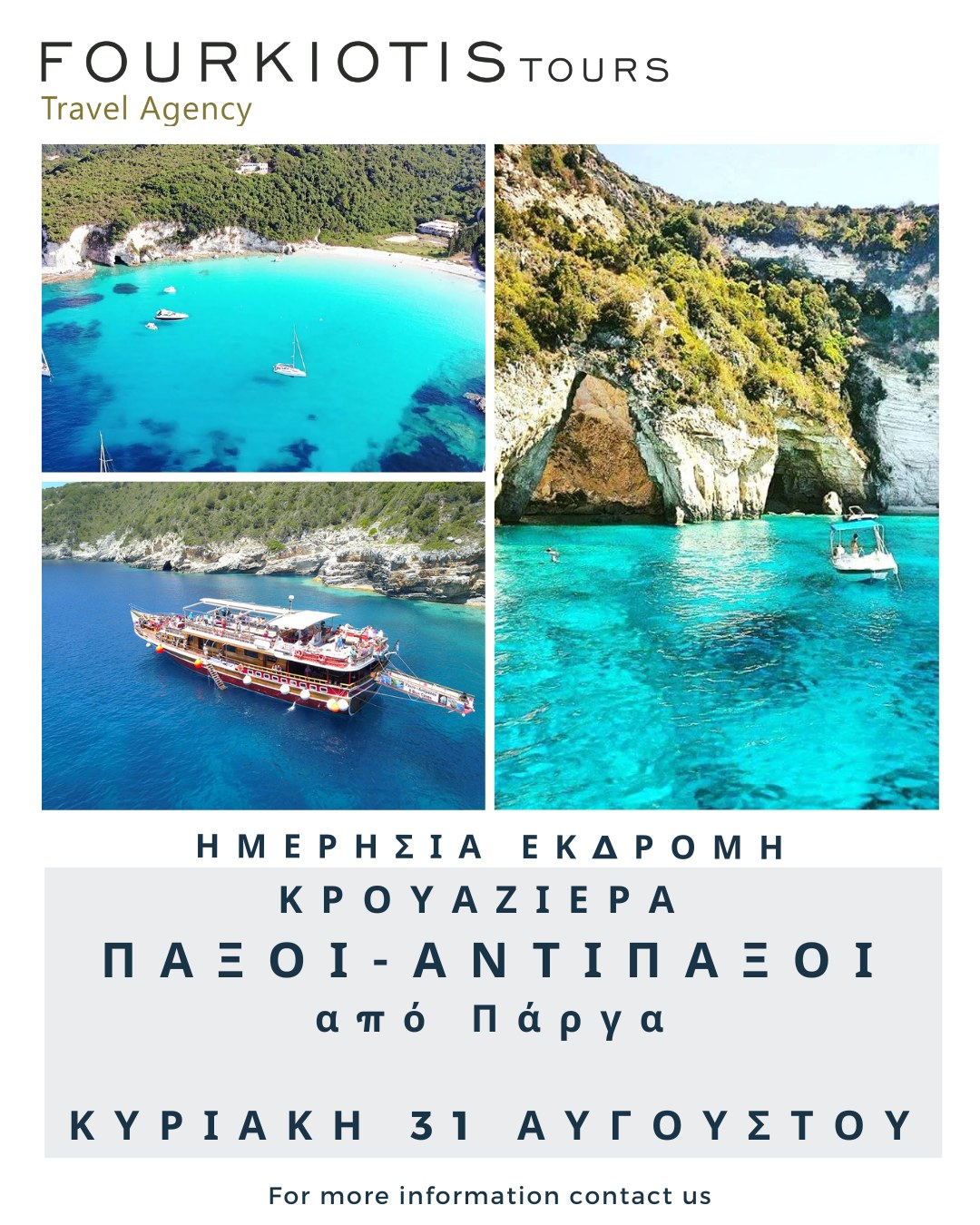 Επόμενη αναχώρηση για την κρουαζιέρα που αγαπήσατε στο νησιωτικό σύμπλεγμα των Παξών με τις δαντελωτές ακτές, τους μικρούς καταγάλανους όρμους, τις θαλάσσιες σπηλιές, τα τοπία άγριας ομορφιάς και την παραδεισένια ατμόσφαιρα την Κυριακή 31 Αυγούστου!