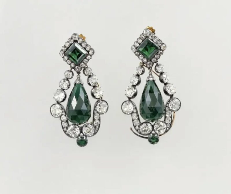 ● Ένα ζευγάρι σκουλαρίκια με σμαράγδια από το σετ κοσμημάτων της Μαρίας Λουίζας
