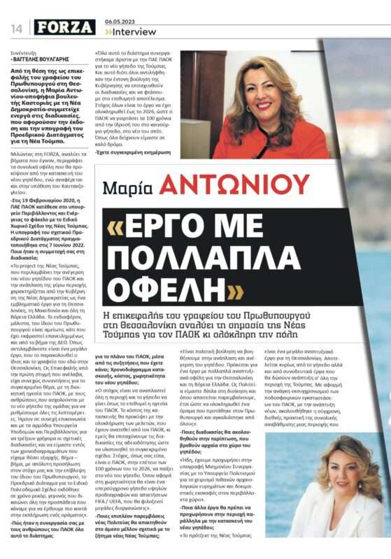 Συνέντευξη στην εφημερίδα Forza και τον Βαγγέλη Βούλγαρη παραχώρησε η Μαρία Αντωνίου. Μίλησε για το project της Νέας Τούμπας, όλα τα βήματα που έγιναν, περιέγραψε τα συνολικά οφέλη που θα προκύψουν από την κατασκευή του νέου γηπέδου και έθεσε τον πλάνο της επόμενης μέρας.