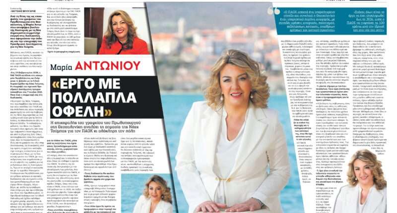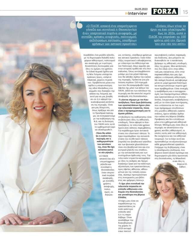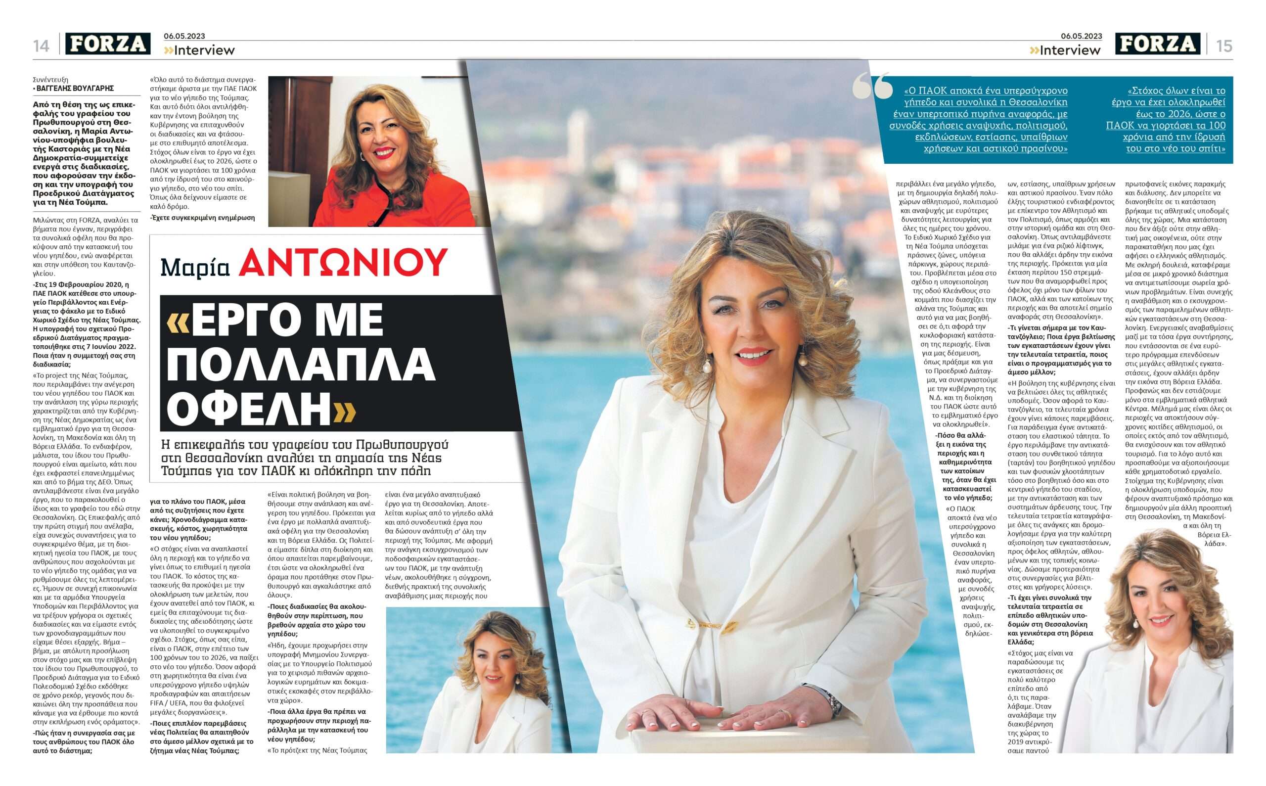 Συνέντευξη στην εφημερίδα Forza και τον Βαγγέλη Βούλγαρη παραχώρησε η Μαρία Αντωνίου. Μίλησε για το project της Νέας Τούμπας, όλα τα βήματα που έγιναν, περιέγραψε τα συνολικά οφέλη που θα προκύψουν από την κατασκευή του νέου γηπέδου και έθεσε τον πλάνο της επόμενης μέρας.