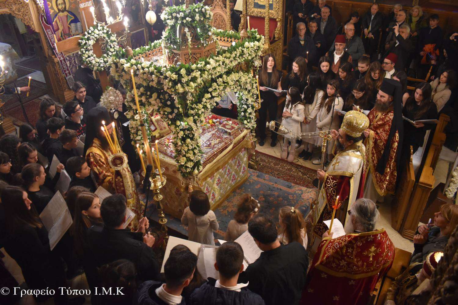 Της Ιεράς ακολουθίας προΐστατο, χοροστατώντας ο Σεβασμιώτατος Μητροπολίτης μας κ. Καλλίνικος. Τόσο κατά την διάρκεια της ακολουθίας, όσο και μετά την ολοκλήρωσή της, οι εκατοντάδες πιστοί προσκύνησαν τον Εσταυρωμένο, που τέθηκε στο μέσον του σολέα, μετά την ανάγνωση του 5 ου Ευαγγελίου σύμφωνα με το τυπικό. Πολλοί ήταν εκείνοι που παρέμειναν προσευχόμενοι ενώπιον του Εσταυρωμένου και μετά το πέρας της Ακολουθίας.