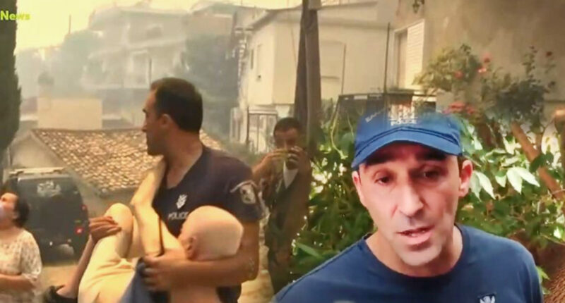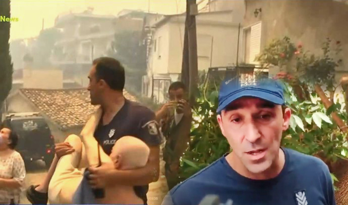 Όπως λέει στην κάμερα του Ertnews, «… η εικόνα ήταν τρομακτική, η φωτιά είχε φτάσει εδώ πλησίον στα σπίτια… ο κόσμος έτρεχε στο δρόμο πανικοβλημένος, μας ζητούσε επιτακτικά να βοηθήσουμε, οι εντολές μας ήταν άμεσα να εκκενώσουμε τα σπίτια, όπως και προσπαθήσαμε και το κάναμε με όλες τις δυνάμεις που είχαμε… η φωτιά είχε φτάσει και έγλυφε το πίσω μέρος των σπιτιών και εκείνη τη στιγμή ενημερώθηκα για έναν ηλικιωμένο άνδρα, ο οποίος βρισκόταν στο τελευταίο σπίτι… Τον σήκωσα στην αγκαλιά μου, τον πήρα με κρατούσε σφιχτά ο άνθρωπος, φοβούμενος, γιατί φώναζε και δεν τον άκουγε κανένας… καταφέραμε να τον κατεβάσουμε και να τον αφήσουμε εδώ πέρα, όπως κάναμε και με τους άλλους δύο ηλικιωμένους ανθρώπους… Ένα μεγάλο ευχαριστώ να δώσω στους κατοίκους, οι οποίοι ήταν οι πρώτοι πρωταγωνιστές, την πυροσβεστική υπηρεσία, αλλά και την υπηρεσία μου, η οποία οι άνθρωποι δεν κοίταξαν ωράριο ή οτιδήποτε και παρέμειναν μέχρι το τέλος να κατασβεστεί η φωτιά…»