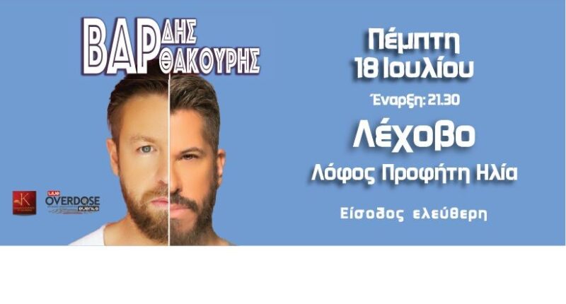 O Χάρης Βαρθακούρης & o Γιάννης Βαρδής στο Λέχοβο! Οι αγαπημένοι ερμηνευτές Χάρης Βαρθακούρης και Γιάννης Βαρδής, συνεχίζουν τις επιτυχημένες τους εμφανίσεις και έρχονται για ένα εκπληκτικό live στο Λόφο του Προφήτη Ηλία στο Λέχοβο Φλώρινας, με τραγούδια που αγαπήσαμε και αγαπάμε!
