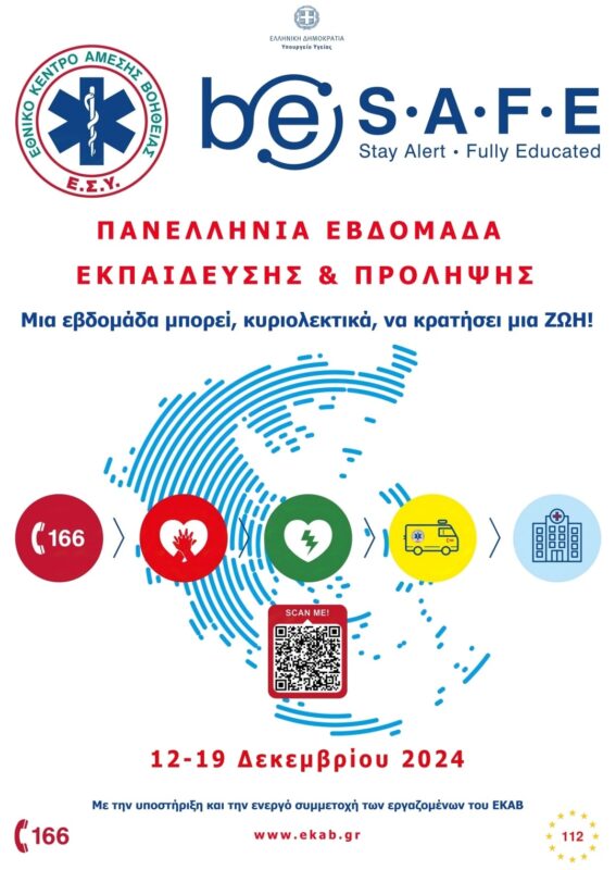 Η Πανελλήνια Εβδομάδα Εκπαίδευσης & Πρόληψης ΕΚΑΒ be S.A.F.E. υλοποιείται από το Τμήμα Εκπαίδευσης του ΕΚΑΒ, με την υποστήριξη τοπικών και περιφερειακών φορέων σε περιοχές της χώρας μας, με στόχο την ευρύτερη ενεργή συμμετοχή και την ενίσχυση της κουλτούρας της πρόληψης, της εκπαίδευσης στις πρώτες βοήθειες και της αλληλεγγύης στην κοινωνία.