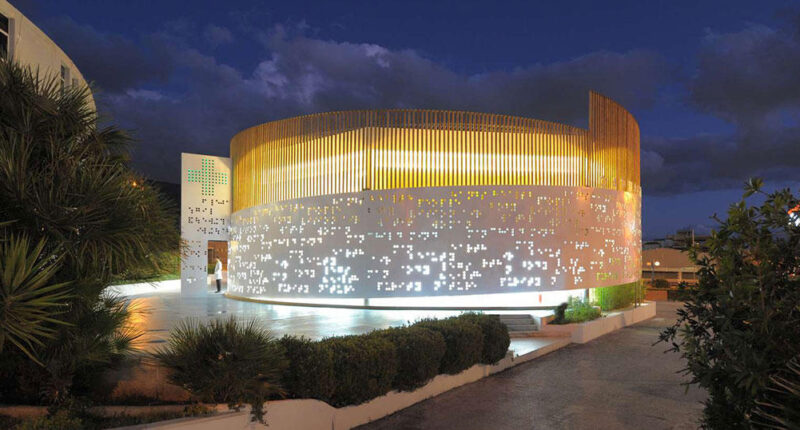 Βασικό χαρακτηριστικό αποτελεί η εξωτερική επένδυση του κτιρίου, που έχει κυλινδρικό σχήμα, όπου κυριαρχούν σύμβολα γραφής του συστήματος Μπράιγ εν είδει ανοιγμάτων πουεπιτρέπουν στο φυσικό φως να μπει απρόσκοπτα στο εσωτερικό.