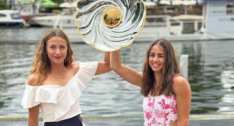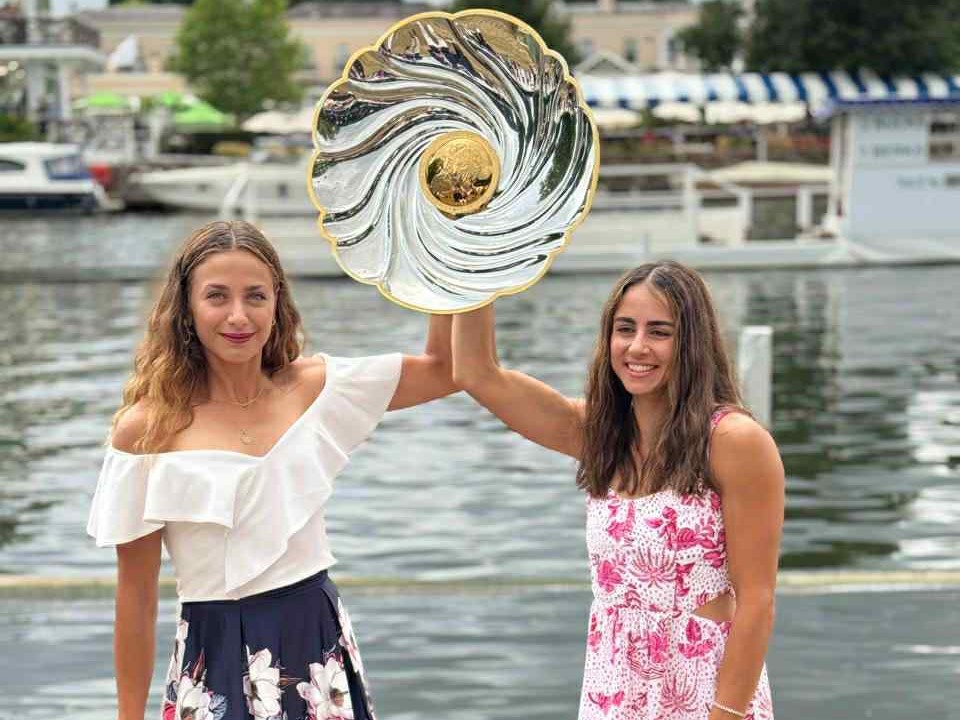 Οι Ελληνίδες «βασίλισσες» της κωπηλασίας. Οι Ευαγγελία Αναστασιάδου-Ζωή Φίτσιου με το βαρύτιμο τρόπαιο του νικητή στο διπλό σκιφ στην Βασιλική Ρεγκάτα του Χένλεϊ.