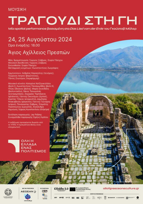 «Όλη η Ελλάδα ένας Πολιτισμός» παρουσιάζουν το έργο: «ΤΡΑΓΟΥΔΙ ΣΤΗ ΓΗ: Μια spatial performance βασισμένη στο Das Lied von der Erde του Gustav Mahler». Μία ελεύθερη καλλιτεχνική υλοποίηση για την υπαρξιακή σύνδεση μεταξύ ανθρώπου και φύσης. Για δύο μόνο παραστάσεις, το Σαββατοκύριακο 24 και 25 Αυγούστου, στη Βασιλική του Αγίου Αχιλλείου στις Λίμνες Πρέσπες.