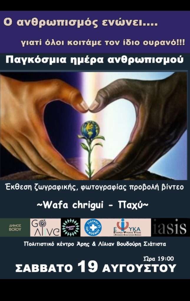 Στις 19 Αυγούστου ημέρα Σάββατο και ώρα 19.00 στο Βουδουρειο Πολιτιστικό Κέντρο Σιάτιστας , παγκόσμια ημέρα ανθρωπισμού , η ζωγράφος Wafa Chriqui σε συνεργασία με το Δήμο Βόιου θα εκθέσει πίνακες ζωγραφικής και φωτογραφίας ενώ παράλληλα θα υπάρξει παρουσίαση οργανώσεων που προσφέρουν ανθρωπιστική βοήθεια.