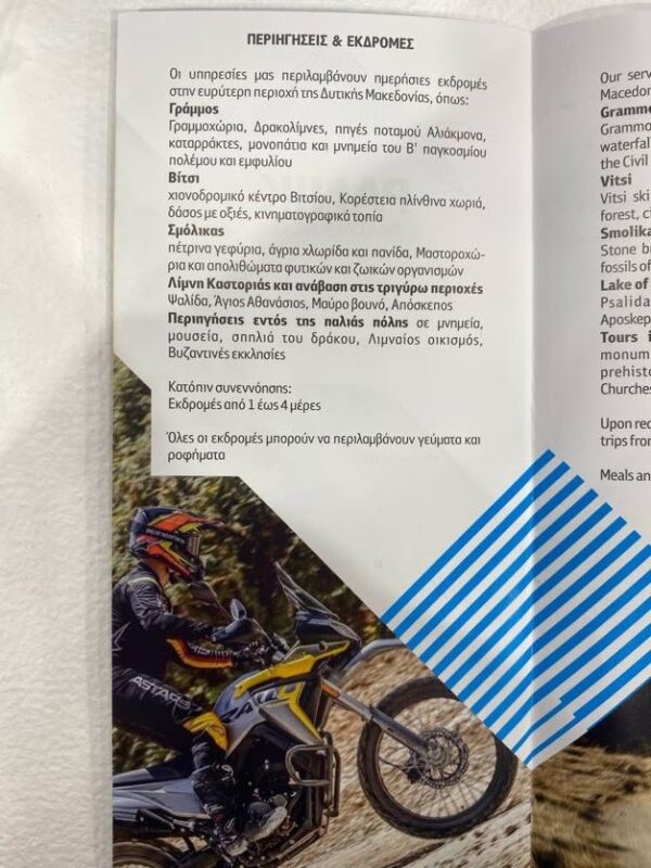 Οι παροχές της Panik είναι πολύπλευρες και πολυεπίπεδες. Προσφέρει εξατομικευμένη εμπειρία προσαρμοσμένη στις επιθυμίες και τις ανάγκες των πελατών της. «Ανάλογα και τα προσωπικά ενδιαφέροντα του καθενός, εγώ το απλώνω πολύ το πράγμα, δε λέω “Α εγώ πάω μόνο στη λίμνη”. Αν θέλει κάποιος να τον πάω στα μουσεία, στην παλιά την πόλη, στα αρχαία που έχουμε ή πάνω στα μνημεία απ’ τον εμφύλιο πόλεμο, σε ιστορικά γεφύρια, οτιδήποτε έχει σχέση με την ανάδειξη της πόλης και της περιοχής, εγώ είμαι διαθέσιμος και πρόθυμος να τους τα πω και να τους τα δείξω, γιατί μ’ αρέσουν κι εμένα, δηλαδή από εκεί ξεκινάει. Δεν το έχω τυποποιημένο, όπου θες μπορώ να σε πάω και να σου εξηγήσω. Έχω και συνεργάτιδα που είναι ξεναγός, μπορεί να σου πει και λεπτομερειακά πολύ περισσότερα πράγματα» μας εξηγεί ο κ. Παπανικολάου. Οι εξορμήσεις που προσφέρονται γίνονται και εντός και εκτός δρόμου, το λεγόμενο off road. «Χρησιμοποιούμε και τους αγροτικούς και τους δασικούς δρόμους, γιατί πάμε σε ορεινούς όγκους και από χωριό σε χωριό ή από περιοχή σε περιοχή, προκειμένου να δούμε σημεία ενδιαφέροντος ή και κάποια ξεχασμένα σημεία που δεν είναι κοινότυπα». Πέρα από την πλούσια -ως προς την φύση και την ιστορία- ξενάγηση που μπορεί να βιώσει όποιος απευθυνθεί στην Panik, οι εκδρομές μπορούν να περιλαμβάνουν και γνωριμία με την τοπική γαστρονομία και οινοποιία. Οι εκδρομείς επισκέπτονται τοπικές ταβέρνες, αλλά και μαγαζιά όπου μπορούν να γνωρίσουν και να αγοράσουν τα προϊόντα της Καστοριάς, όπως φασόλια, μήλα κρεατικά, τυριά και τσάι. Εκτός από την γευσιγνωσία προσφέρεται και οινογευσία στα ντόπια οινοποιεία.