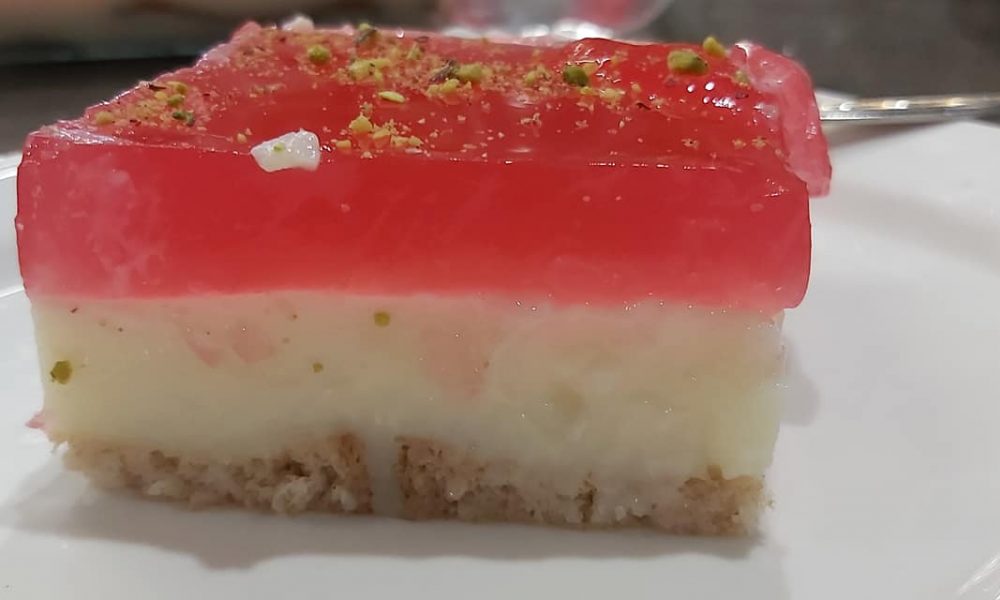 Μόλις κρυώσει η κρέμα αφαιρούμε τη μεμβράνη και προσθέτουμε το ζελέ που έχει κρυώσει και αυτό αλλά δεν έχει πήξει. Βάζουμε το γλυκό στο ψυγείο να πήξει καλά. Οταν το βγάλουνε να το σερβίρουμε πασπαλίζουμε την επφάνεια με λίγο τριμμένο φιστίκι Αιγίνης (χαλεπιανα).