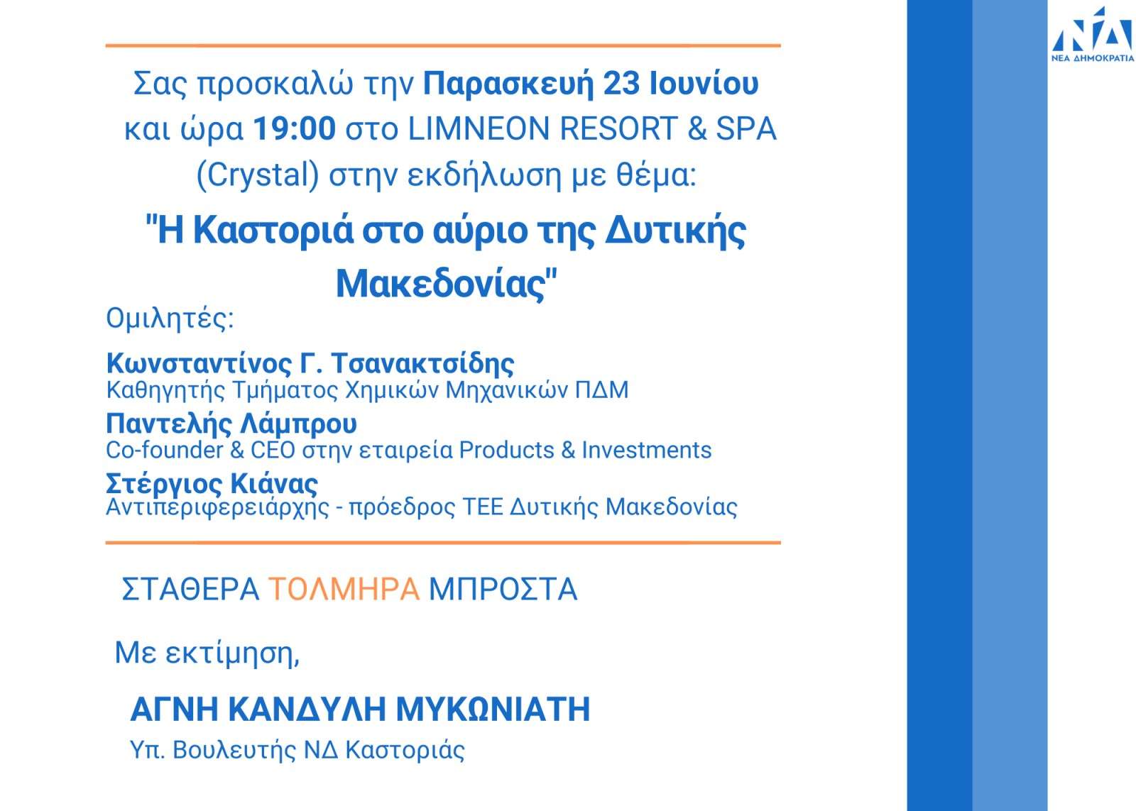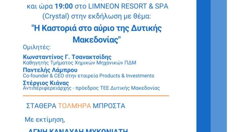 Σας προσκαλώ την Παρασκευή 23 Ιουνίου και ώρα 19:00 στο LIMNEON RESORT & SPA (Crystal) στην εκδήλωση με θέμα: “Η Καστοριά στο αύριο της Δυτικής Μακεδονίας”.