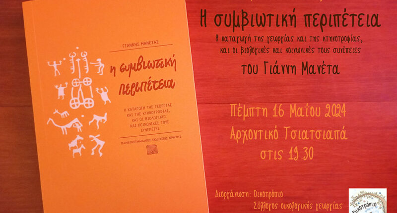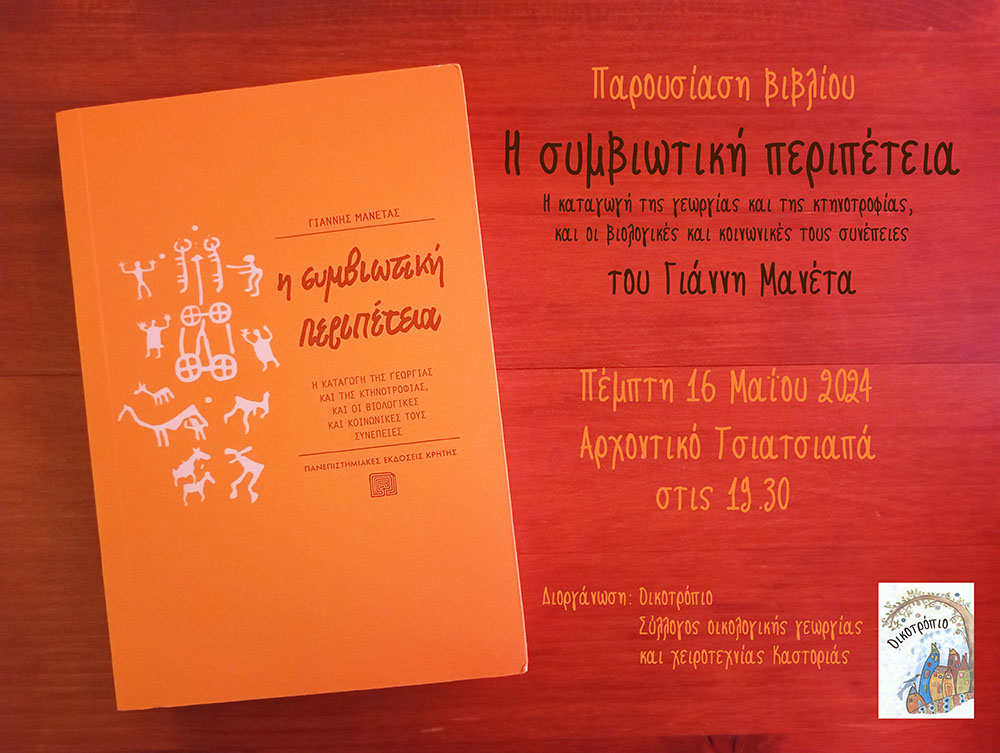 Το οικοτρόπιο σας καλεί στην παρουσίαση του βιβλίου “Η συμβιωτική περιπέτεια – Η καταγωγή της γεωργίας και της κτηνοτροφίας, και οι βιολογικές και κοινωνικές τους συνέπειες” που θα πραγματοποιηθεί στο Αρχοντικό Τσιατσιαπά, την Πέμπτη 16 Μαΐου, στις 19.30.