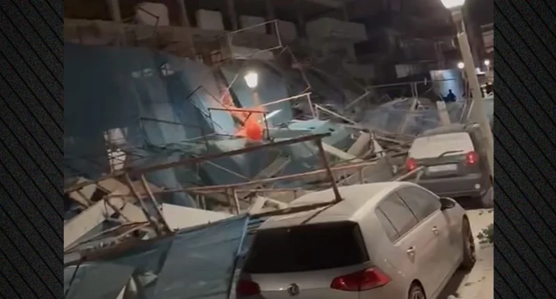 Οι σκαλωσιές καταπλάκωσαν πάνω από 20 σταθμευμένα αυτοκίνητα που ήταν στο σημείο, αναφέρει η rodiaki.gr.