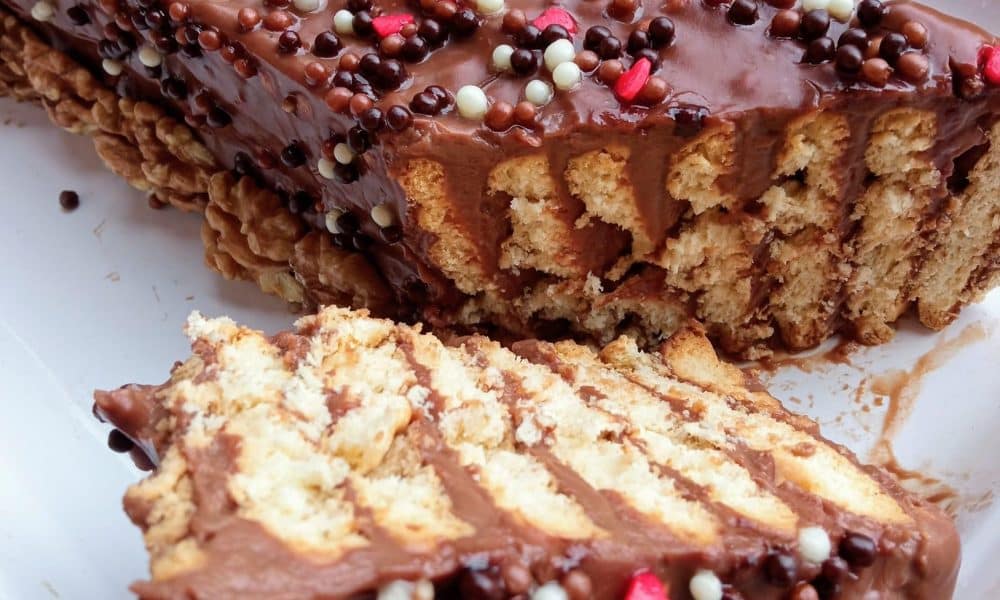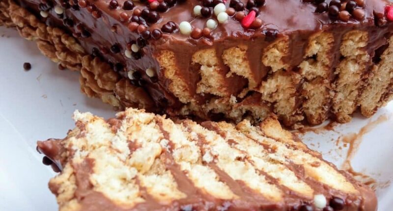 Στη συνέχεια, μπορούμε να στολίσουμε το γλυκό με μπισκότα ή σοκολατάκια ή άλλο της προτίμησής μας.