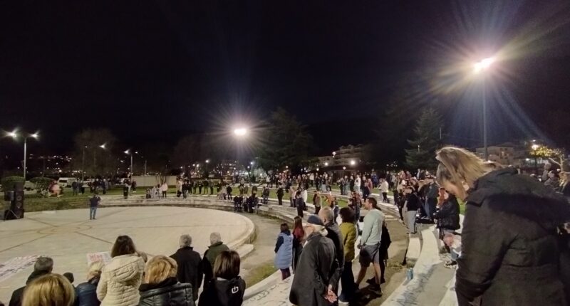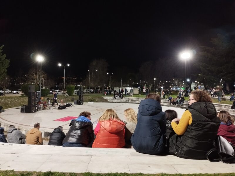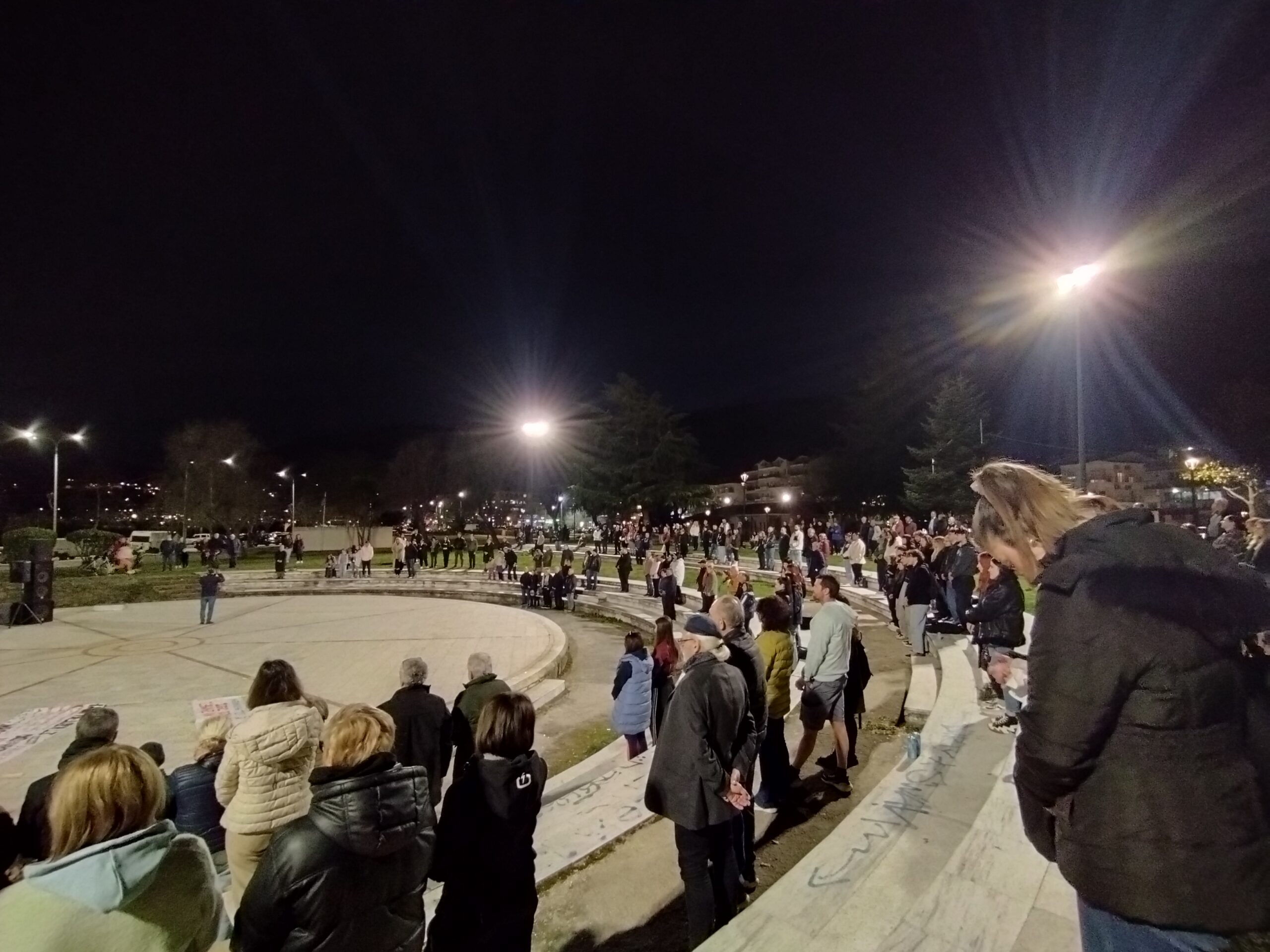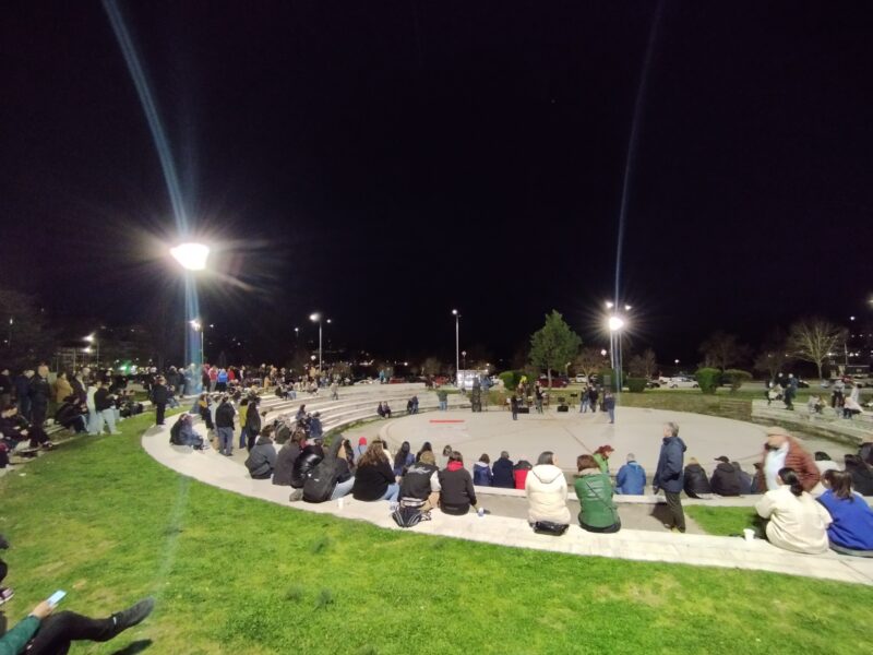 Στο Πάρκο Ολυμπιακή Φλόγας χθες το βράδυ ακούστηκαν αιτήματα, φωνές και μουσικές για δικαιοσύνη για τις 57 επιβεβαιωμένες ψυχές που χάθηκαν στα Τέμπη.