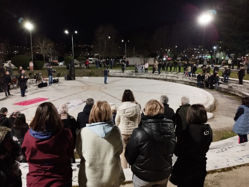 Σε μια συγκέντρωση-συναυλία διαμαρτυρίας που οργανώθηκε από σωματεία και συλλόγους του νομού, κάποιοι απ’ τους διοργανωτές έκαναν μερικές σύντομες τοποθετήσεις, το Πάρκο σίγησε για 57 δευτερόλεπτα προς τιμήν των νεκρών και τοπικά μουσικά σχήματα έπαιξαν έντεχνα κομμάτια.