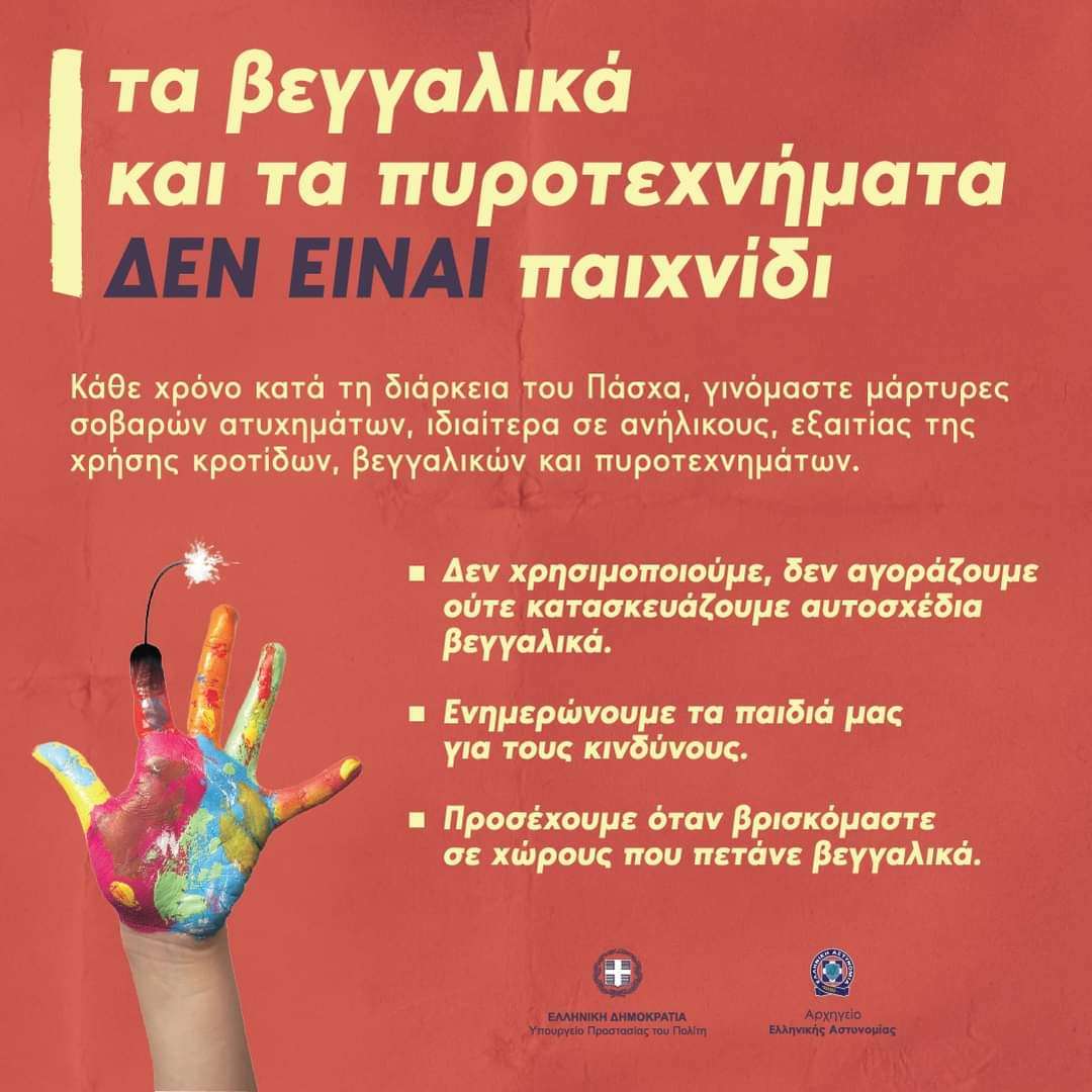 Επειδή κάθε χρόνο, πριν και κατά τη διάρκεια των Εορτών του Πάσχα, γινόμαστε μάρτυρες σοβαρών ατυχημάτων, ιδιαίτερα σε ανήλικους, εξαιτίας της επικίνδυνης συνήθειας χρήσης παράνομων κροτίδων, παιδικών αθυρμάτων, βεγγαλικών και άλλων ειδών πυροτεχνίας κατά τη διάρκεια των εορτών του Πάσχα, η Γενική Περιφερειακή Αστυνομική Διεύθυνση Δυτικής Μακεδονίας, σας υπενθυμίζει ότι: