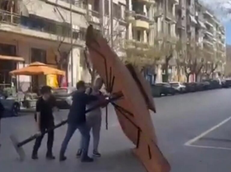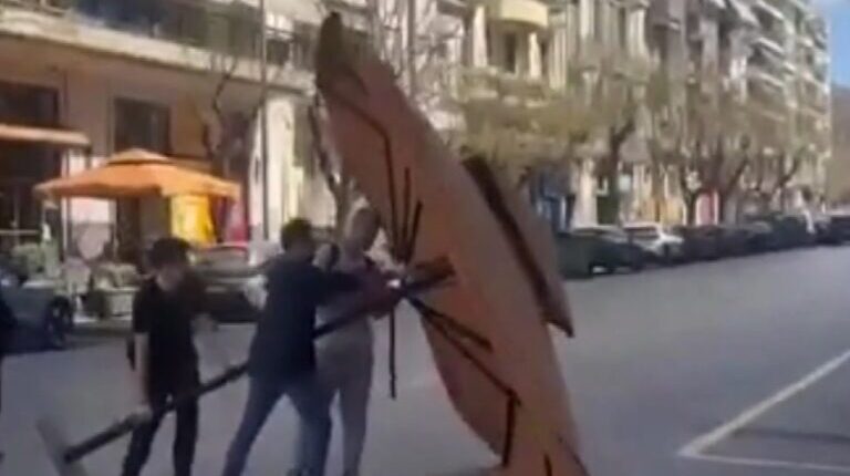 Πρόκειται για μεγάλη ομπρέλα (είθισται να έχουν τσιμέντο στη βάση τους για σταθερότητα) που έφυγε από τη θέση της, από κατάστημα, στην αρχή της οδού Αγίου Δημητρίου, λόγω των ισχυρών ανέμων και έφτασε σχεδόν στη μέση του δρόμου.