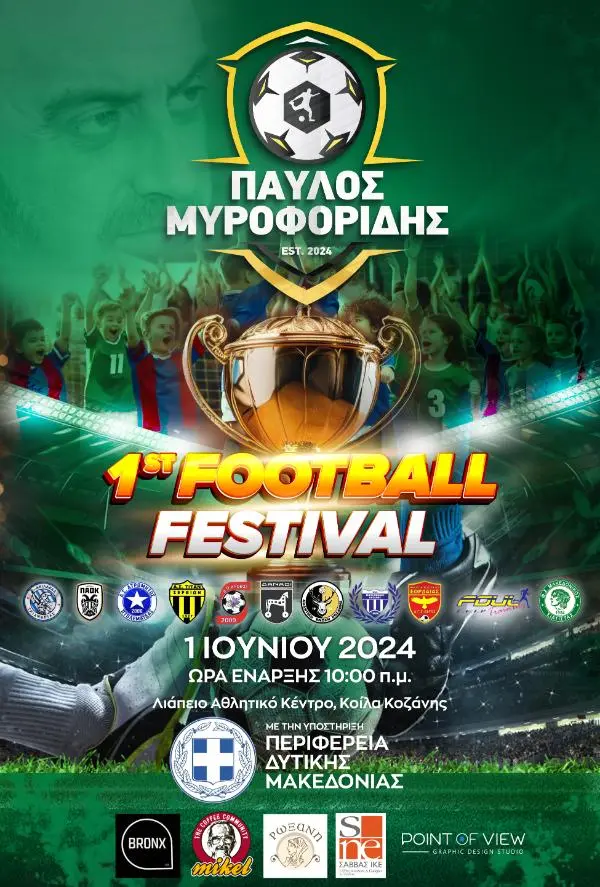 Σας προσκαλούμε στο 1ο παιδικό football festival στη μνήμη του Παύλου Μυροφορίδη που θα διεξαχθεί το Σάββατο στις 01-06-2024 παρουσία πολλών ομάδων, πολλών παιδιών αλλά και ποδοσφαιριστών εγνωσμένης αξίας που έρχονται να τιμήσουν τον αγαπημένο μας Παύλο.