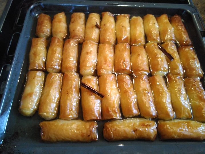 Παίρνουμε ένα φύλλο το κόβουμε στην μέση, βάζουμε βούτηρο, το διπλώνουμε στην μέση, βάζω 1 κτσ. γεμάτη κρέμα και τυλίγω σε ρολό. Ετσι κάνουμε για όλα τα φύλλα .