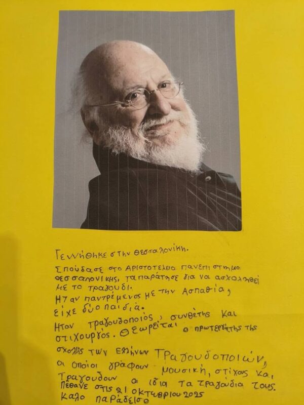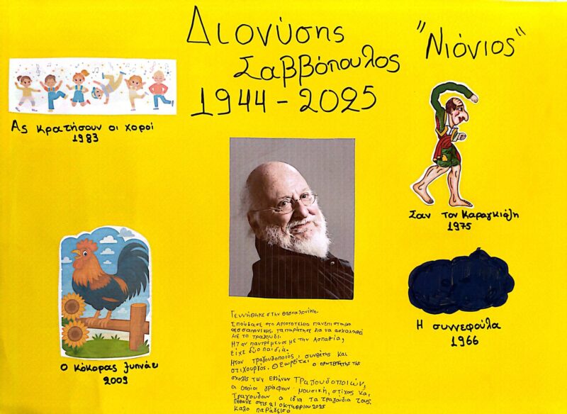 Up next Αναρρίχηση στα βράχια, στα πλαίσια των παράλληλων δράσεων της 8ης Πανελλήνιας Συνάντησης Μονοπατιών Published on 23 Οκτωβρίου 2025 Author Α. Μ. Αφιερώσαμε την σημερινή ημέρα στο Διονύση Σαββόπουλο. Στο τμήμα χορωδίας τραγουδήσαμε μερικά από τα πιο γνωστά του τραγούδια και μιλήσαμε για τη ζωή και το έργο του. Στο εργαστήριο εικαστικών φτιάξαμε όλοι μαζί ένα κολάζ με τίτλους από τα τραγούδια που μας άγγιξαν περισσότερο! Καλό ταξίδι στο φως “Νιόνιο”…