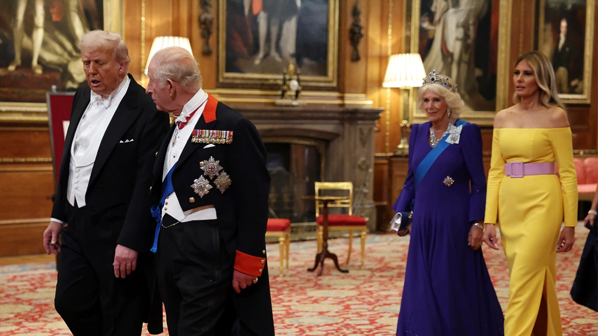 Στην τεράστια τραπεζαρία των 50 μέτρων, με την εντυπωσιακή οροφή διακοσμημένη με τα εμβλήματα των Ιπποτών, ο Κάρολος κάθισε στο κέντρο πλάι στον Τραμπ, με την Κάθριν εκ δεξιών του Αμερικανού προέδρου.