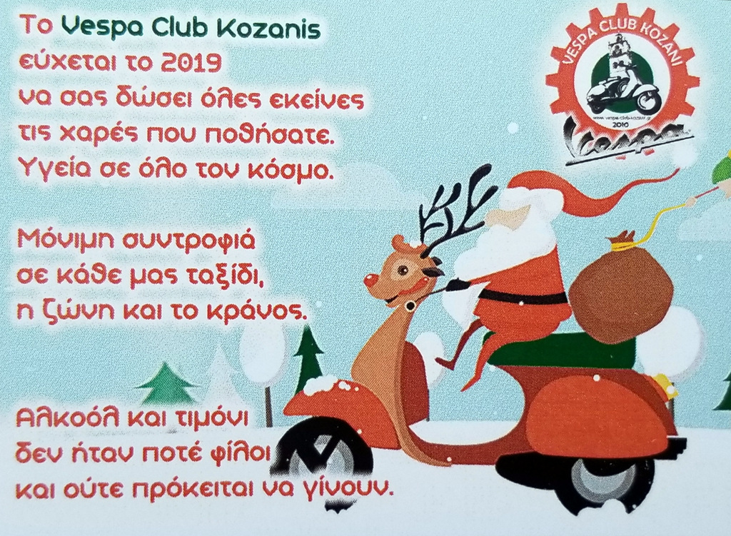Με σύνθημα «αλκοόλ και τιμόνι δεν ήταν ποτέ φίλοι και ούτε πρόκειται να γίνουν», τα μέλη του Vespa Club Kozani βρέθηκαν το απόγευμα της Κυριακής 30 Δεκεμβρίου στην συμβολή των οδών 11ης Οκτωβρίου και Γκέρτσου και μοίρασαν φυλλάδια για την οδική ασφάλεια στους διερχόμενους οδηγούς. Στόχος της δράσης ήταν η ευαισθητοποίηση των οδηγών σχετικά με τη χρήση κράνους και ζώνης ασφαλείας και γενικά της τήρησης του Κώδικα Οδικής Κυκλοφορίας. Τα φυλλάδια συνόδευσαν νόστιμα σοκολατένια μελομακάρονα και ευχές για ένα καλό και ασφαλές 2019.