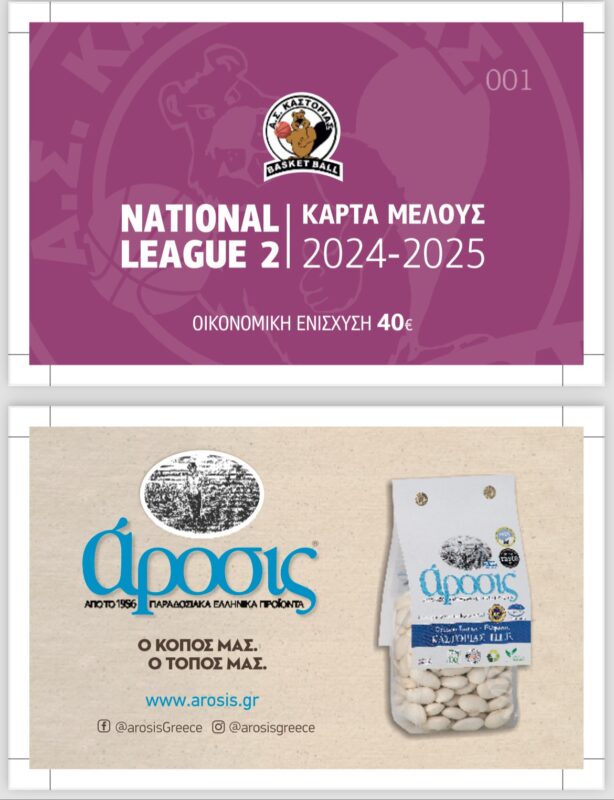Ξεκίνησε η διάθεση των καρτών διαρκείας του Α.Σ. Καστοριάς-άροσις για το Πρωτάθλημα της National League 2 της αγωνιστικής περιόδου 2024-2025. Η ομάδα μας θα αγωνιστεί στον 4ο όμιλο της National League 2 και ο πρώτος αγώνας έχει οριστεί για τις 6 Οκτωβρίου 2024 εντός έδρας, με την ομάδα των Αετών Βέροιας.